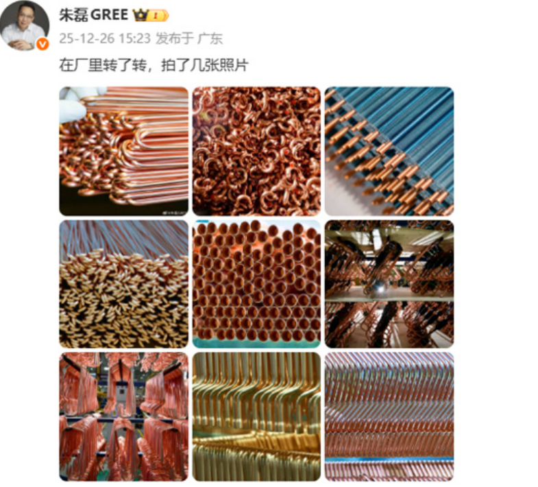 近日,格力市场总监朱磊在微博晒出了工厂图,现场满满的全是空调铜管。此举也是在回应近期的争议,尤其是海尔、